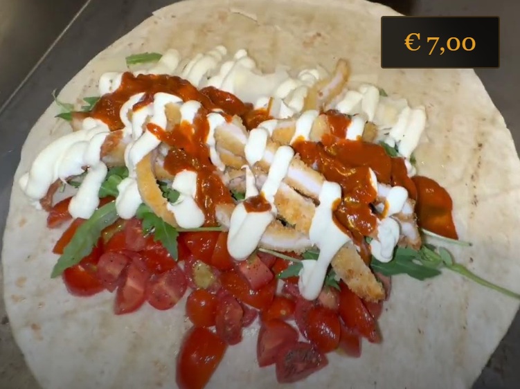 Un wrap semplice e goloso, pensato per chi ama il gusto autentico della cotoletta in una versione più leggera e pratica. Le striscioline di pollo croccante portano subito soddisfazione, mentre la rucola fresca aggiunge una nota vivace e leggermente amaricante. La maionese completa il tutto con una cremosità equilibrata, creando un mix pulito, ordinato e piacevole in ogni morso. Perfetto per una pausa veloce ma ricca di gusto.